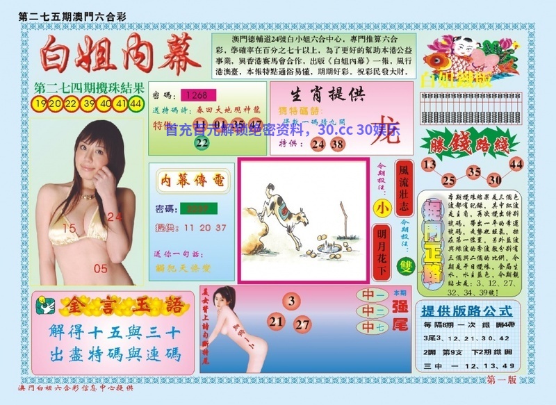 278期《白姐九肖》 综合九肖♘:鼠牛鸡虎猪猴狗马兔 综合七肖♘:鼠牛鸡虎猪猴狗 综合五肖♘:鼠牛鸡虎猪 ![]() |